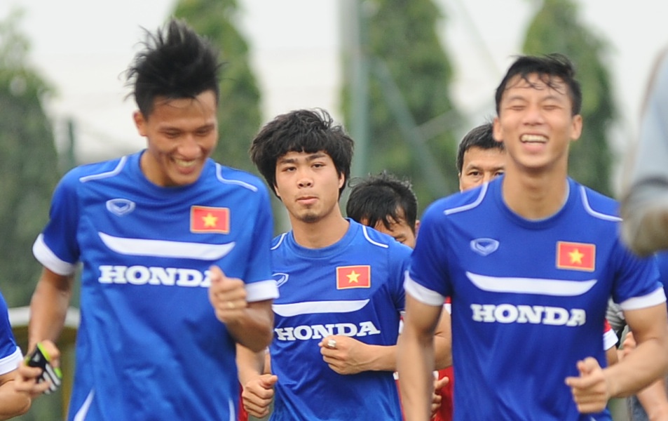 | Vẻ mặt của Công Phượng khá trầm ngâm bên cạnh các đàn anh cười sảng khoái sau khi kết thúc buổi tập nặng chiều 26/2. |