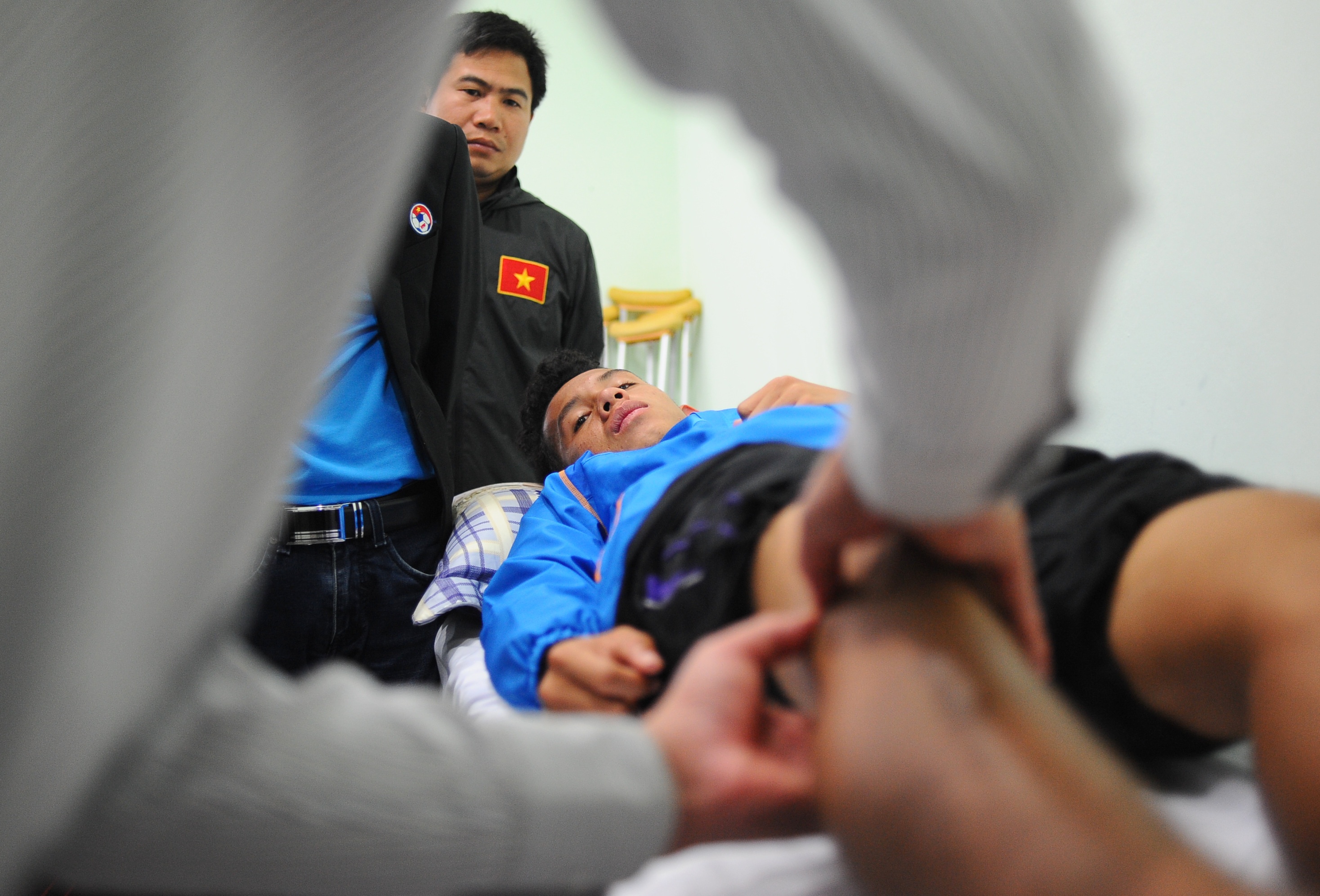 | Bác sĩ Nguyễn Trọng Hiền thăm khám 3 trường hợp chấn thương của Olympic Việt Nam. |