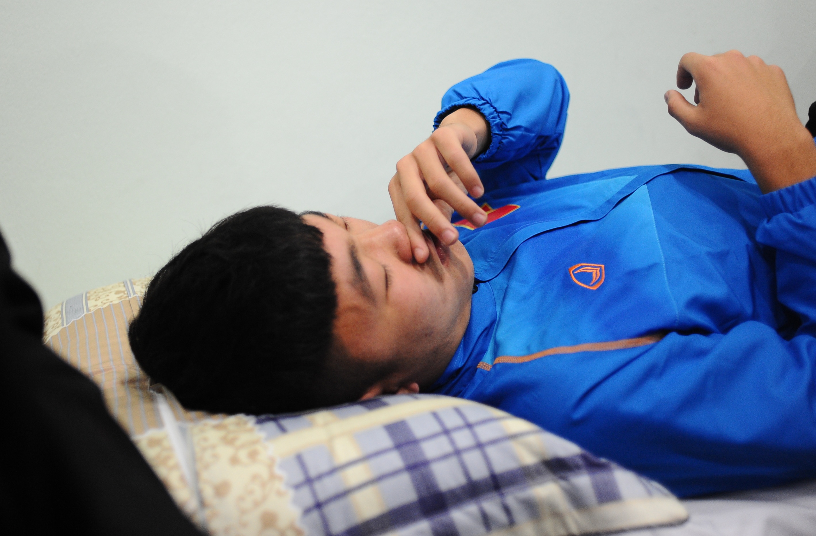 | Xuân Trường lo lắng nằm trong phòng khám ở Trung tâm Huấn luyện Thể thao Quốc gia Hà Nội. |
