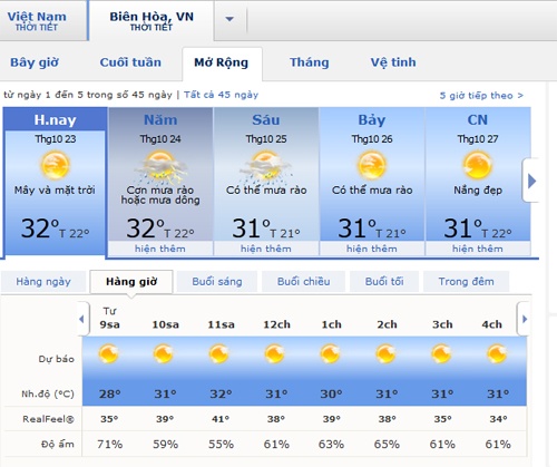 | Dự báo thời tiết tại TP. Biên Hòa trong chiều nay. Còn theo dự báo của Trung tâm khí tưởng thủy văn trung ương, thời tiết hôm nay tại Đồng Nai quang mây, trời nắng, lặng gió, độ ẩm 83%, nhiệt độ từ 22 – 29 độ C. |