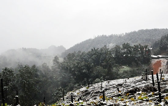| Khu vực tổ 10, thị trấn Sa Pa, tuyết rơi từ 5h sáng đã phủ trắng cây cối. |