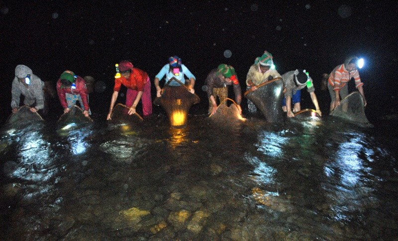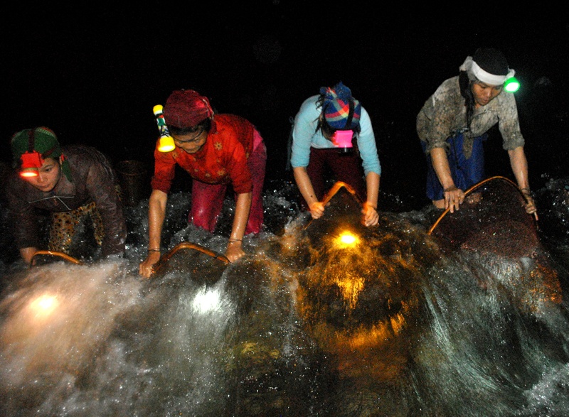 | Trong trời đêm dày đặc sương mù, ánh sáng của chiếc đèn pin trên đầu những người phụ nữ đi xúc cá lấp lánh, nhảy múa dưới dòng khe Nậm Xan với đủ màu sắc. Họ chia thành một hàng ngang đi xúc cá giữa con suối. |