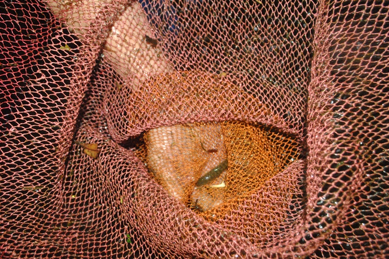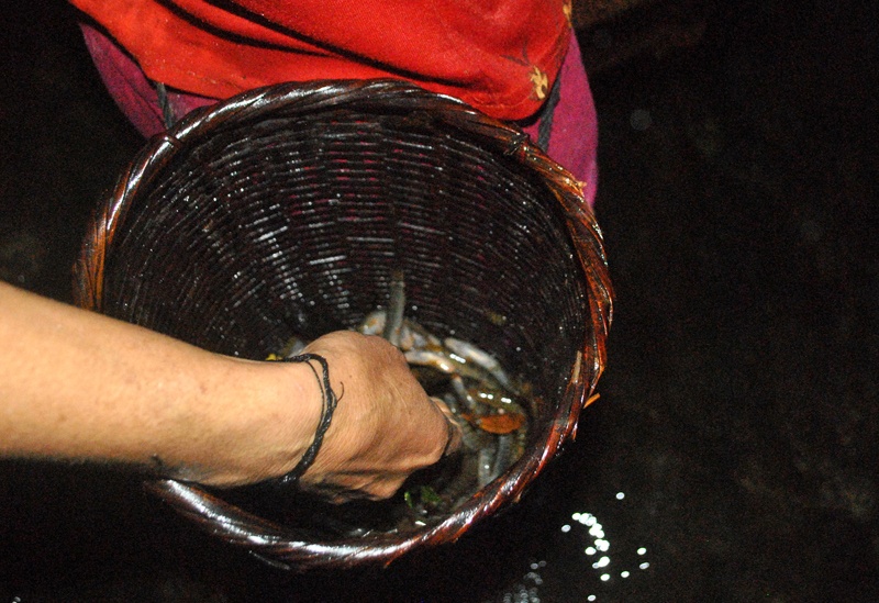 | Dụng cụ để hành nghề xúc cá cũng rất đơn giản, chỉ cần một chiếc "vinh" (dùng để xúc cá), một đèn pin và chiếc giỏ đựng cá xúc được. |