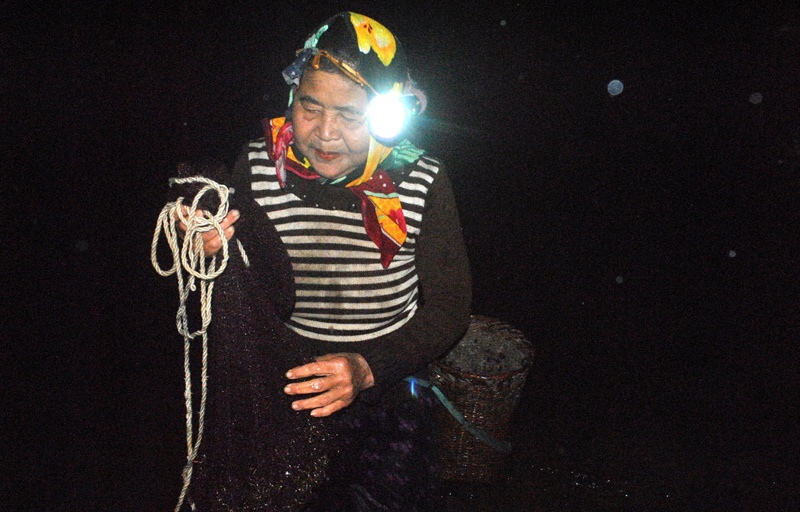| Những người phụ nữ sinh ra ở Tam Quang ai cũng thành thạo việc xúc cá. Họ xem đây là một nghề tay trái để kiếm sống. |