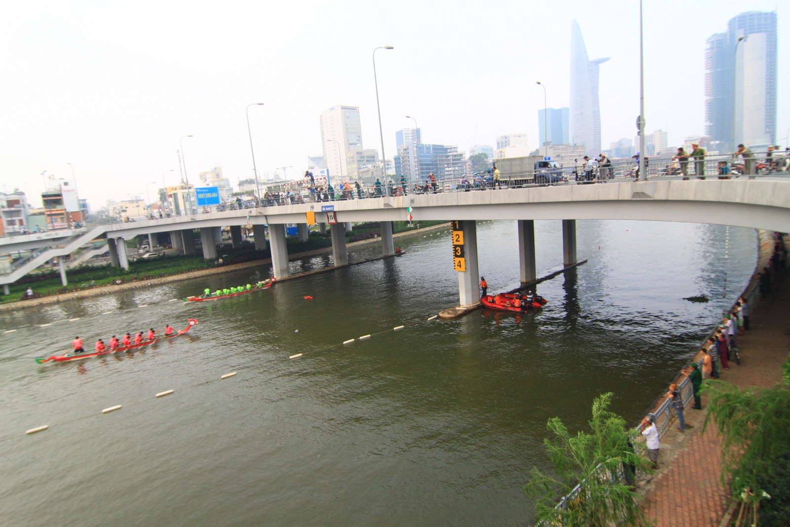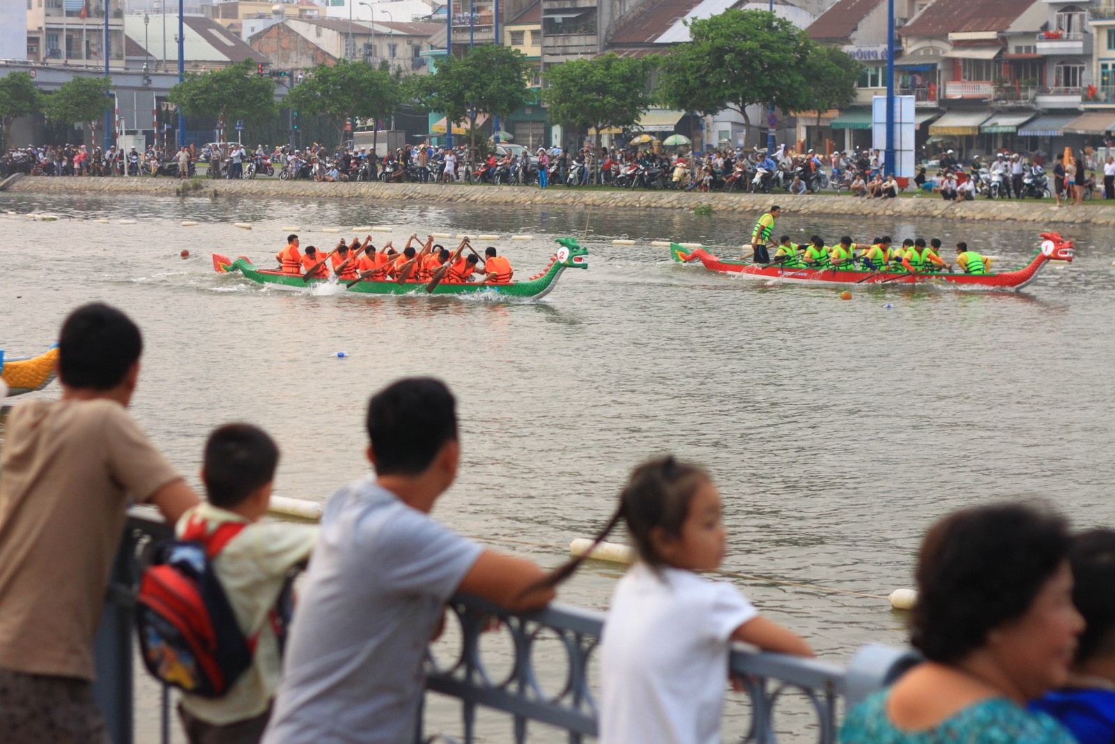 Đông đảo người dân thành phố tập trung 2 bờ kênh, trên cầu xem đua thuyền.