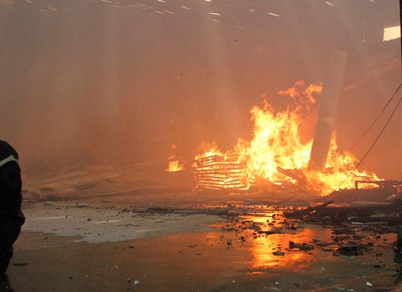 | Lửa bốc cháy dữ dội trong xưởng sản xuất gỗ. Ảnh: Ngọc An |
