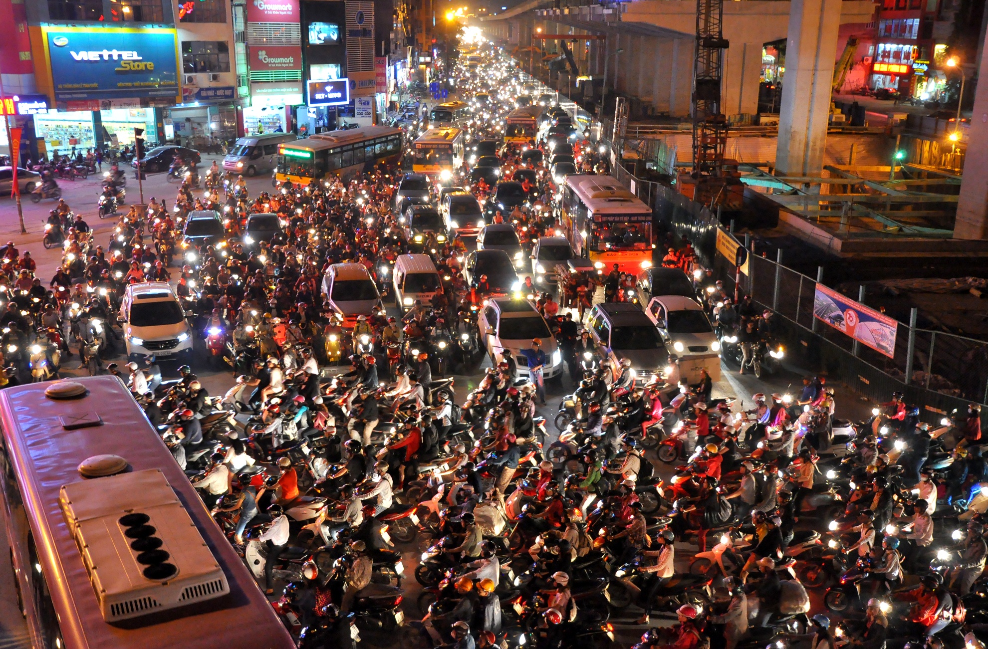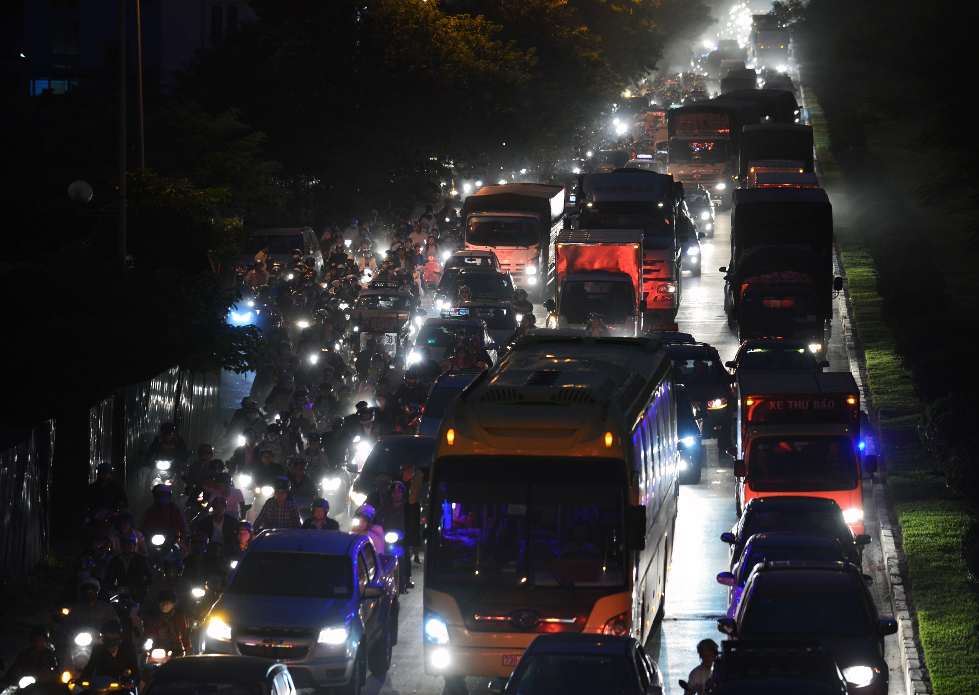 Gần 19h, khu vực từ đường Tố Hữu về Nguyễn Trãi giao thông vẫn chưa giảm nhiệt, xe từ vành đai 3 thoát xuống dàn hàng 2 hòa vào dòng xe phía dưới gây nên cảnh ùn ứ kéo dài.