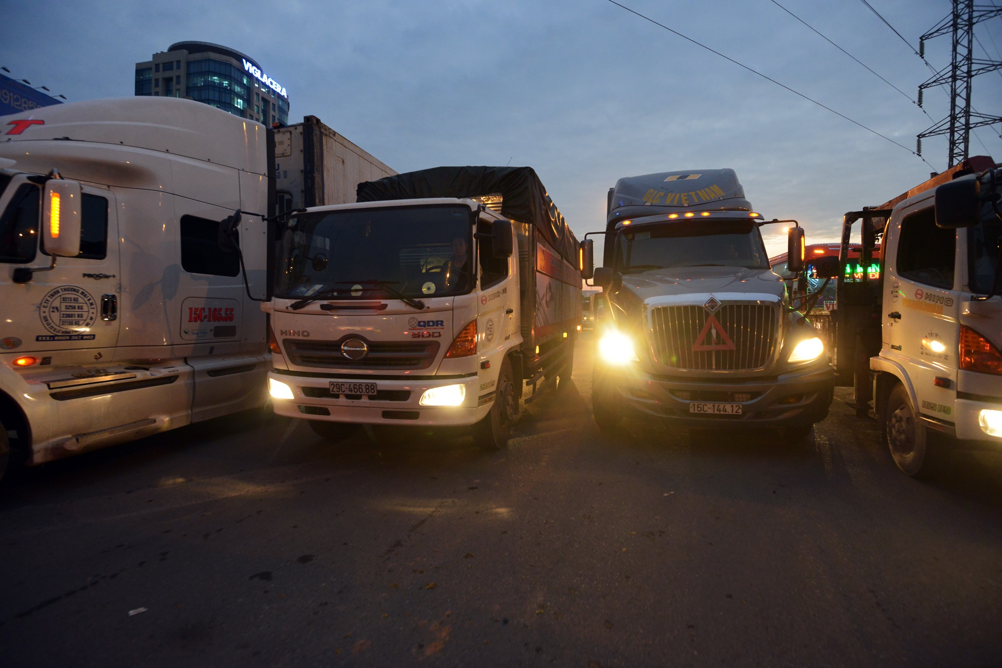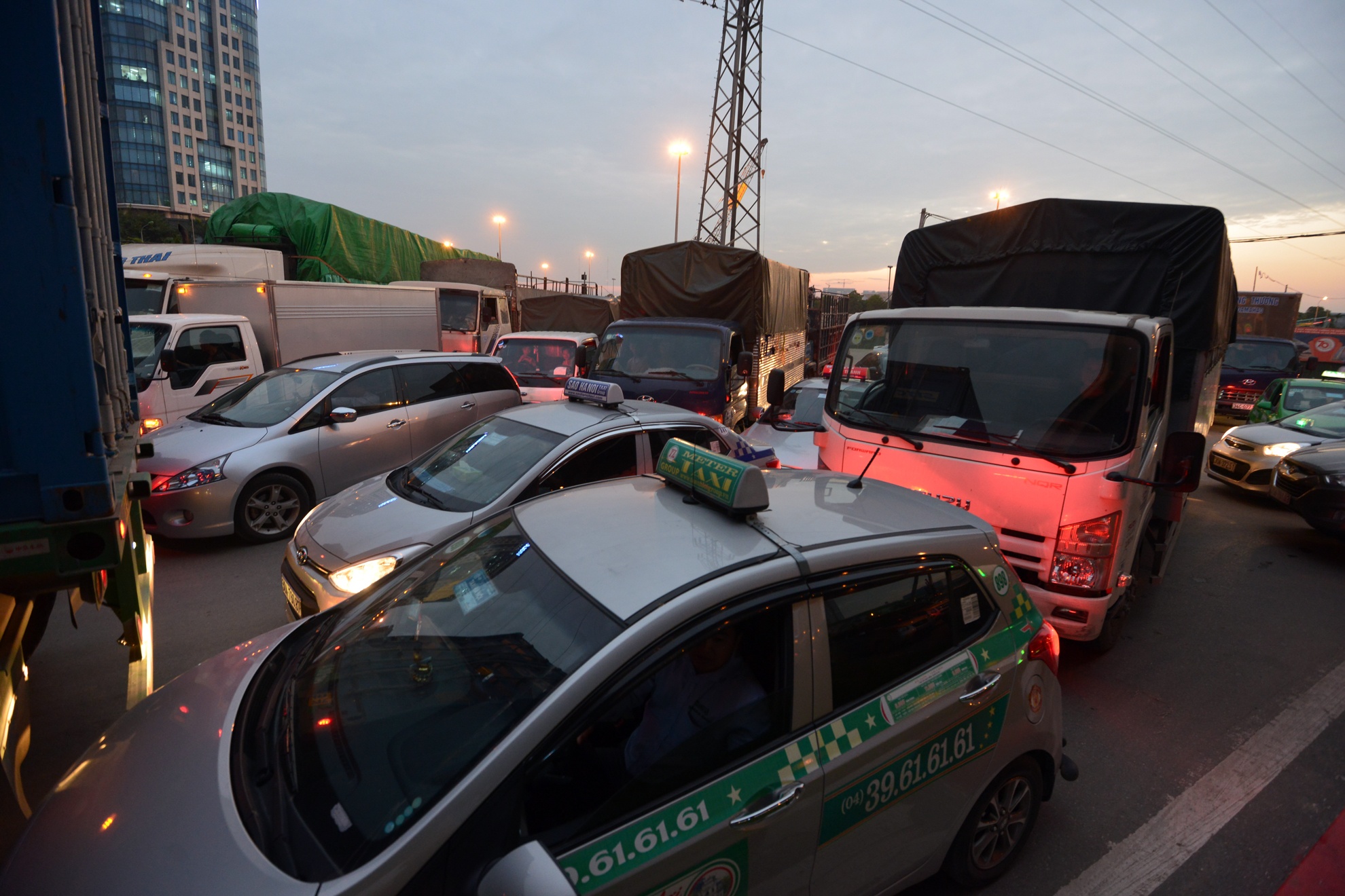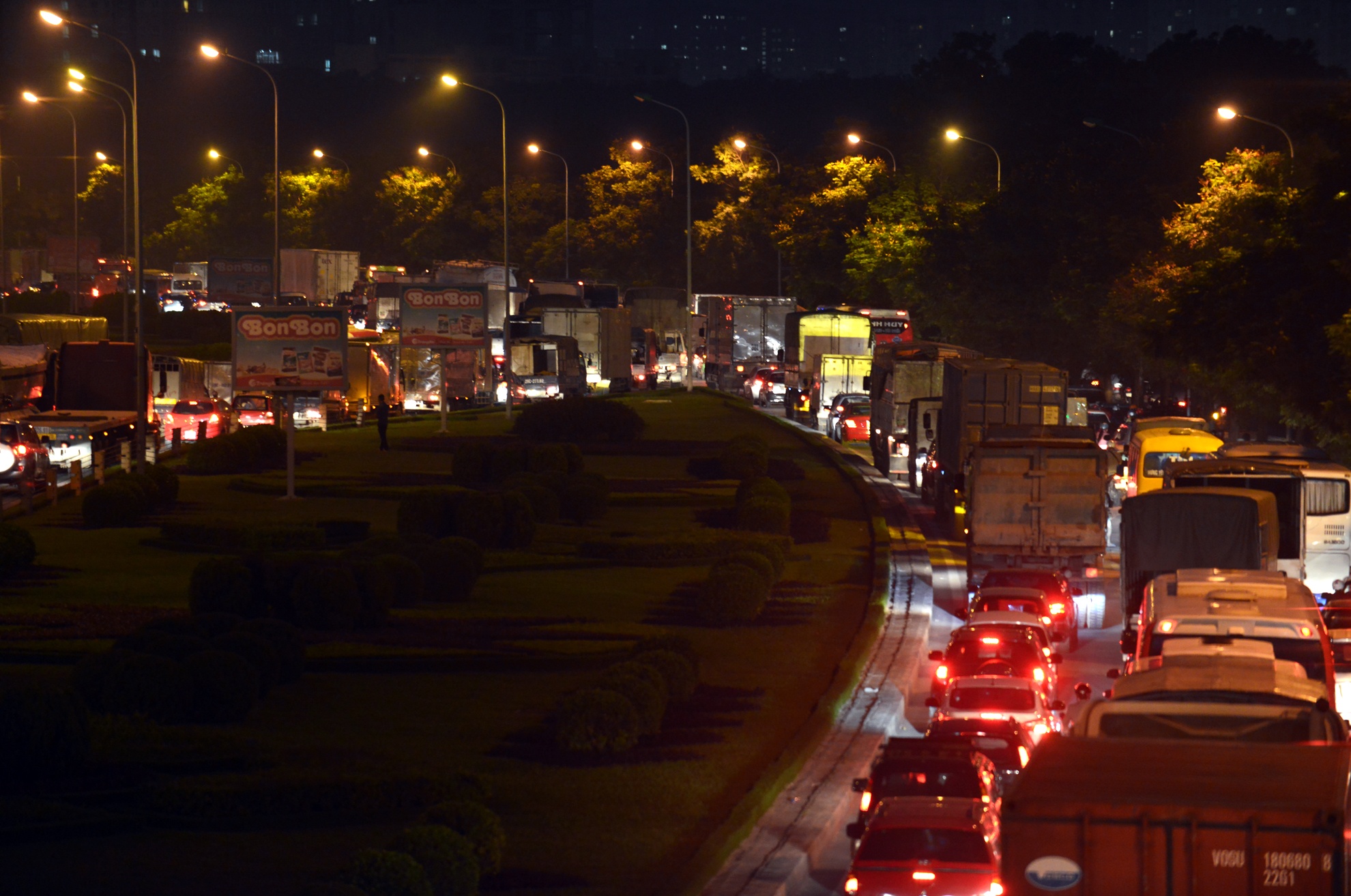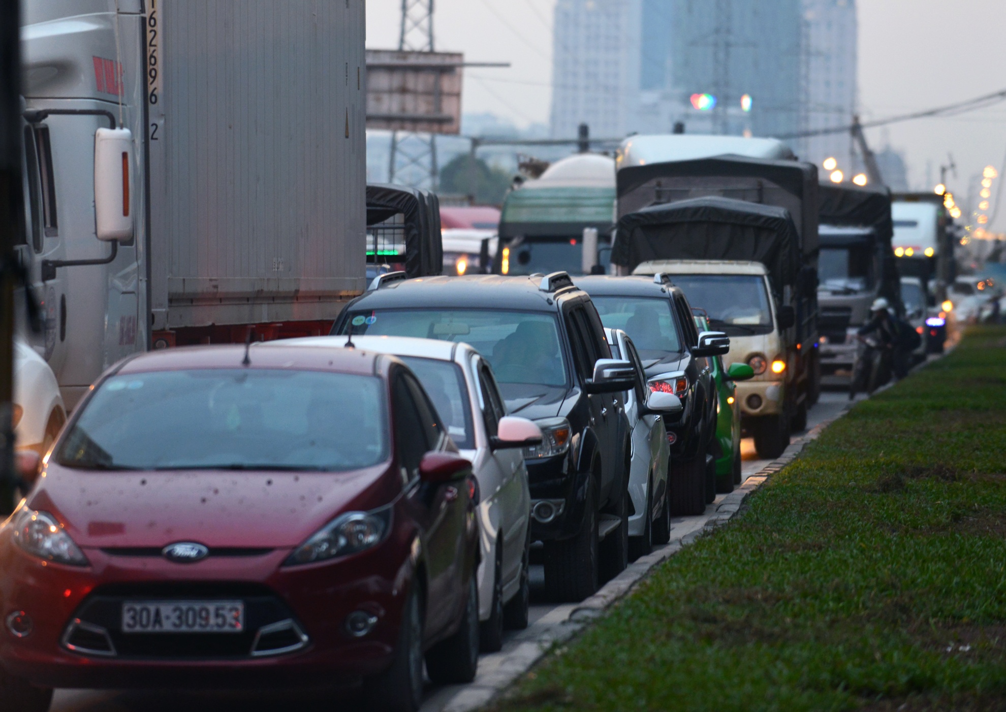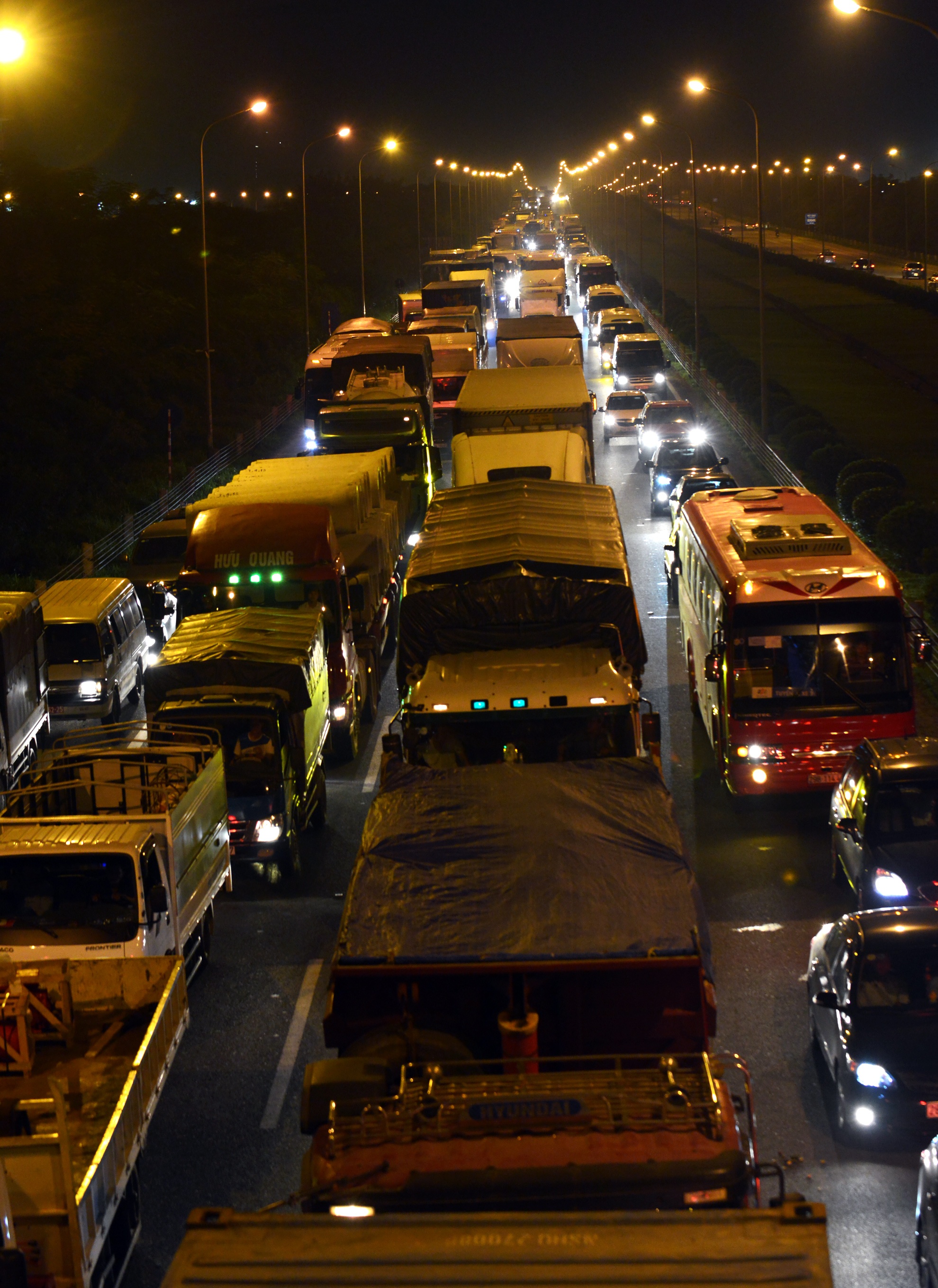 Ôtô hàng ngang làn 3 làn 4, đứng im trên đường.