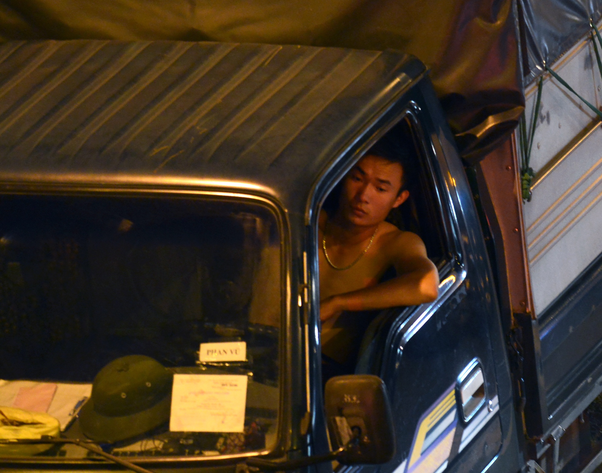 Một tài xế xe tải dừng xe, tắt máy ngồi nhìn dòng xe ken cứng.