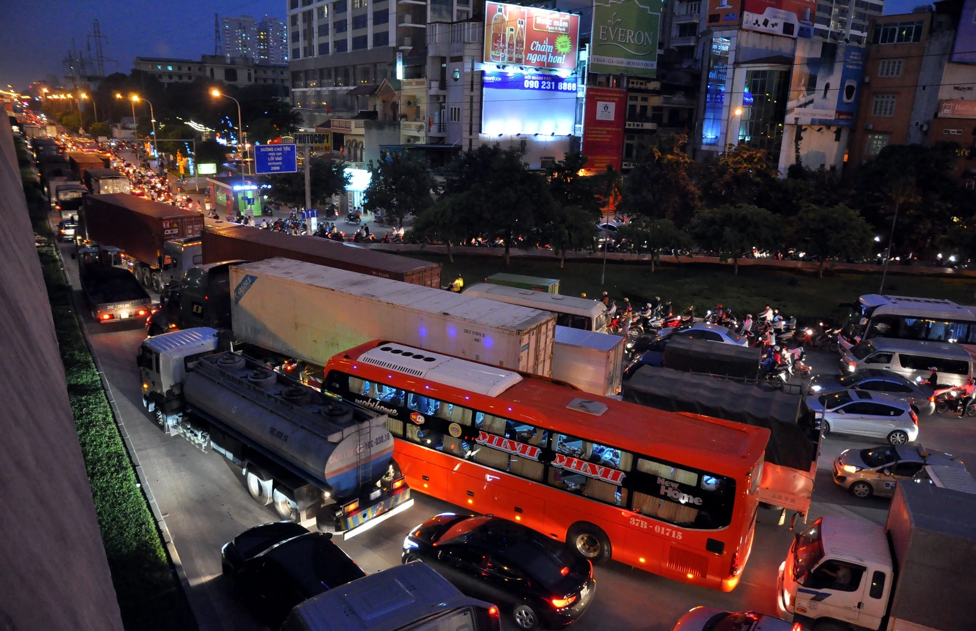Theo các chiến sĩ CSGT số 7 cho biết, thời điểm 17h15 tại chân dốc lên cầu cạn vành đai 3 xảy ra va va chạm giữa xe khách Minh Minh (tuyến Vinh - Mỹ Đình) với xe bồn chở xăng tại nút giao đại lộ Thăng Long - Khuất Duy Tiến khiến tuyến đường ùn ứ kéo dài.