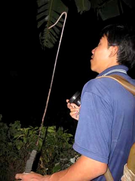 Đồ nghề là một cây sào bằng tre có một thân sắt được uốn cong thành hình lưỡi câu buộc chặt trên đọt sào và một bộ đèn pin rọi sáng, dao quắm, lưới, bao tải, dây thừng. Vậy là đủ hành trang cho một chuyến bắt rắn đêm. Trời ngớt mưa, tôi cùng anh Sân và một vài người nữa rời khỏi nhà bắt đầu một cuộc hành trình nhọc nhằn tìm rắn mưu sinh.