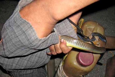 Sợ hãi, tôi vội lùi ra xa hơn 3m để đảm bảo khoảng cách an toàn. Anh Sân cười bảo loài rắn này có cắn thì cùng lắm là chảy máu thôi chứ không độc như những loài rắn hổ, rắn lục. Anh Sân đi một vòng quanh bụi cây quan sát địa thế, rồi từ từ lấy cây sào bắt rắn đang cầm trên tay đưa thẳng về hướng con rắn đang nằm. Một hành động nhanh như chớp. Anh Sân giật mạnh móc sắt tung ra hướng mình. Con rắn bị móc sắt kéo văng ra ngay vị trí anh đứng. Anh vội đưa tay chụp lấy giữa thân con rắn một cách gọn lỏn khi nó chưa kịp chạm xuống đất. Tay phải cầm rắn quây tròn nhiều vòng rồi đưa tay trái vuốt từ dưới đuôi con rắn lên ngay vị trí cổ của rắn rồi nắm chặt.