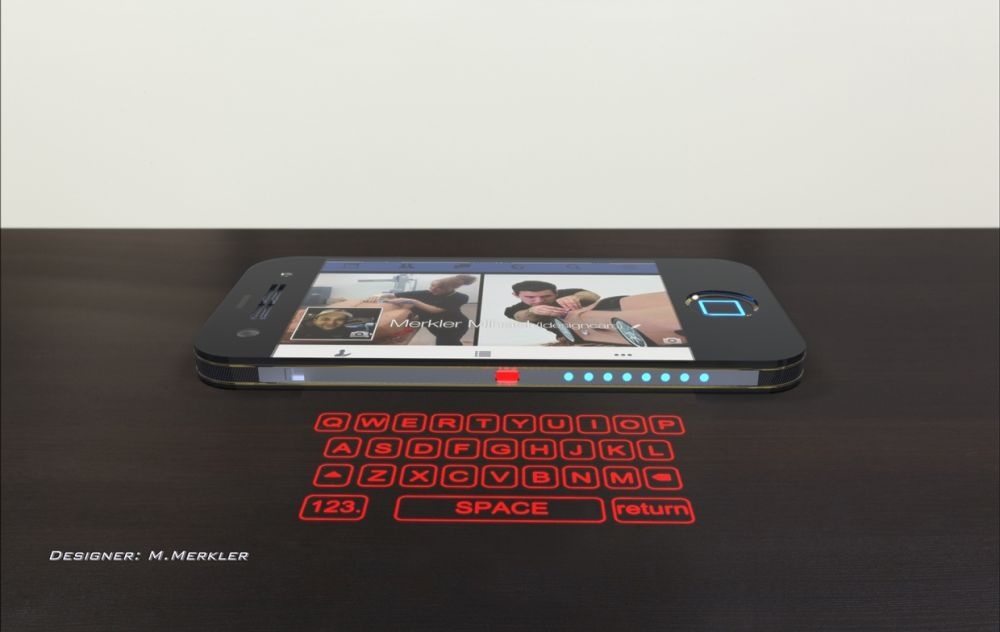 | Cạnh còn lại của iPhone 8 có thêm một máy chiếu laser để giả lập một bàn phím ảo trên mọi mặt phẳng. |