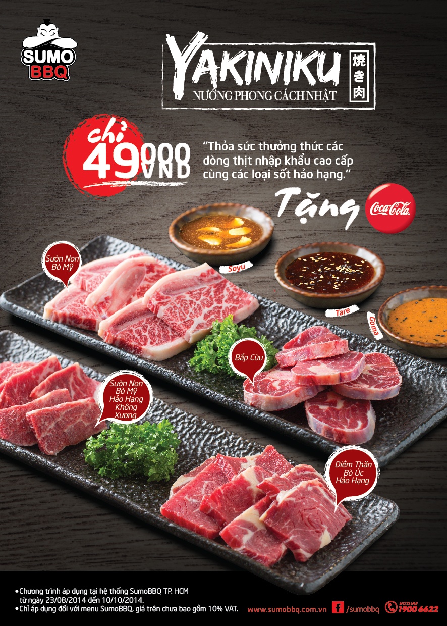 Từ ngày 23/8, SumoBBQ ra mắt menu Special Offer mới với 4 loại thịt cao cấp: sườn non bò Mỹ, bắp cừu, sườn non bò Mỹ không xương và diềm thăn bò Úc hảo hạng với giá không đổi 49.000 đồng. Điểm đặc biệt của phong cách nướng Yakiniku, chỉ có tại SumoBBQ, là khách hàng có thể tự tay trải nghiệm việc chế biến món thịt nướng theo khẩu vị của mình bằng cách chọn ướp thịt với 3 loại sốt tự chọn đặc biệt: Goma - sốt tương bùi vị mè đen & mè trắng, Tare - sốt tương ngọt thơm vị táo, lê và Soyu - sốt tương đen truyền thống thơm vị tỏi, gừng.