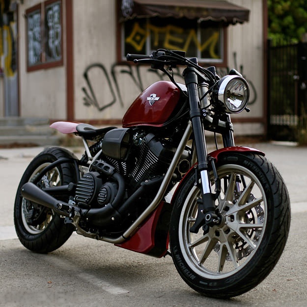 Để đáp ứng những thay đổi ở kết cấu khung xe, chiếc Bolt độ còn được tinh chỉnh và thay thế ở hệ thống treo phía trước. Dáng vẻ mới mẻ ở phần đầu xe có được do sử dụng bộ phuộc lấy từ chiếc Yamaha YZF-R1.