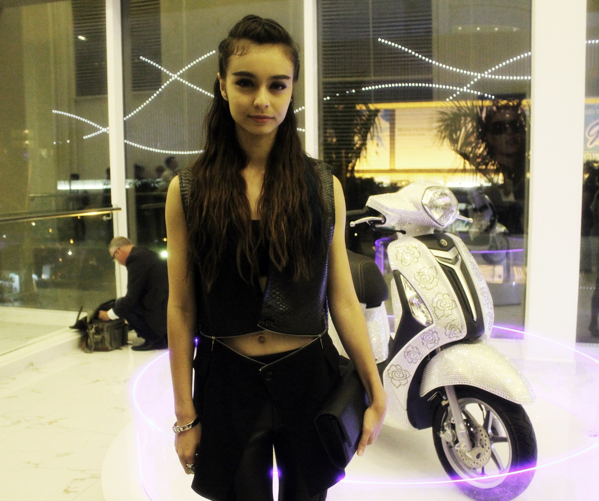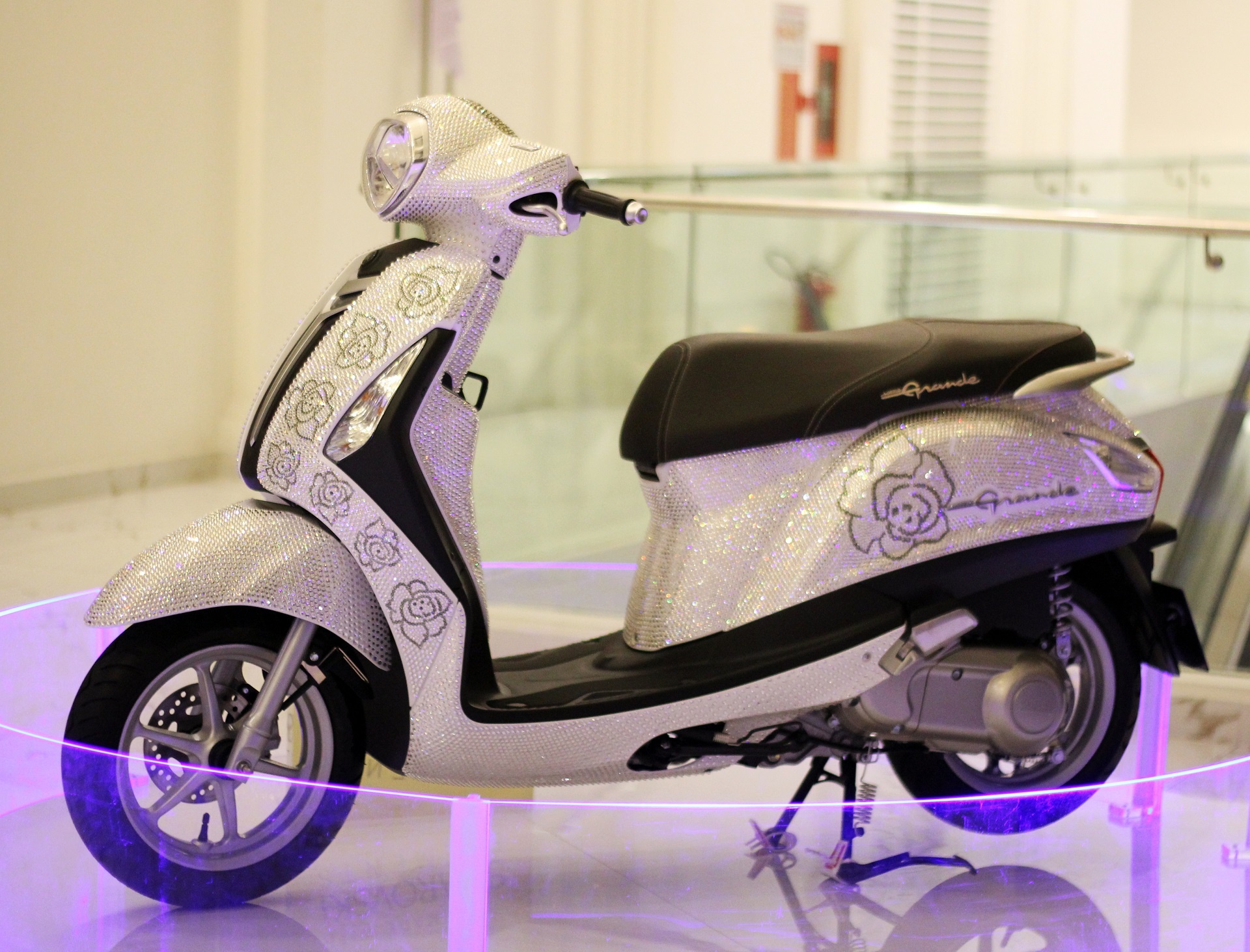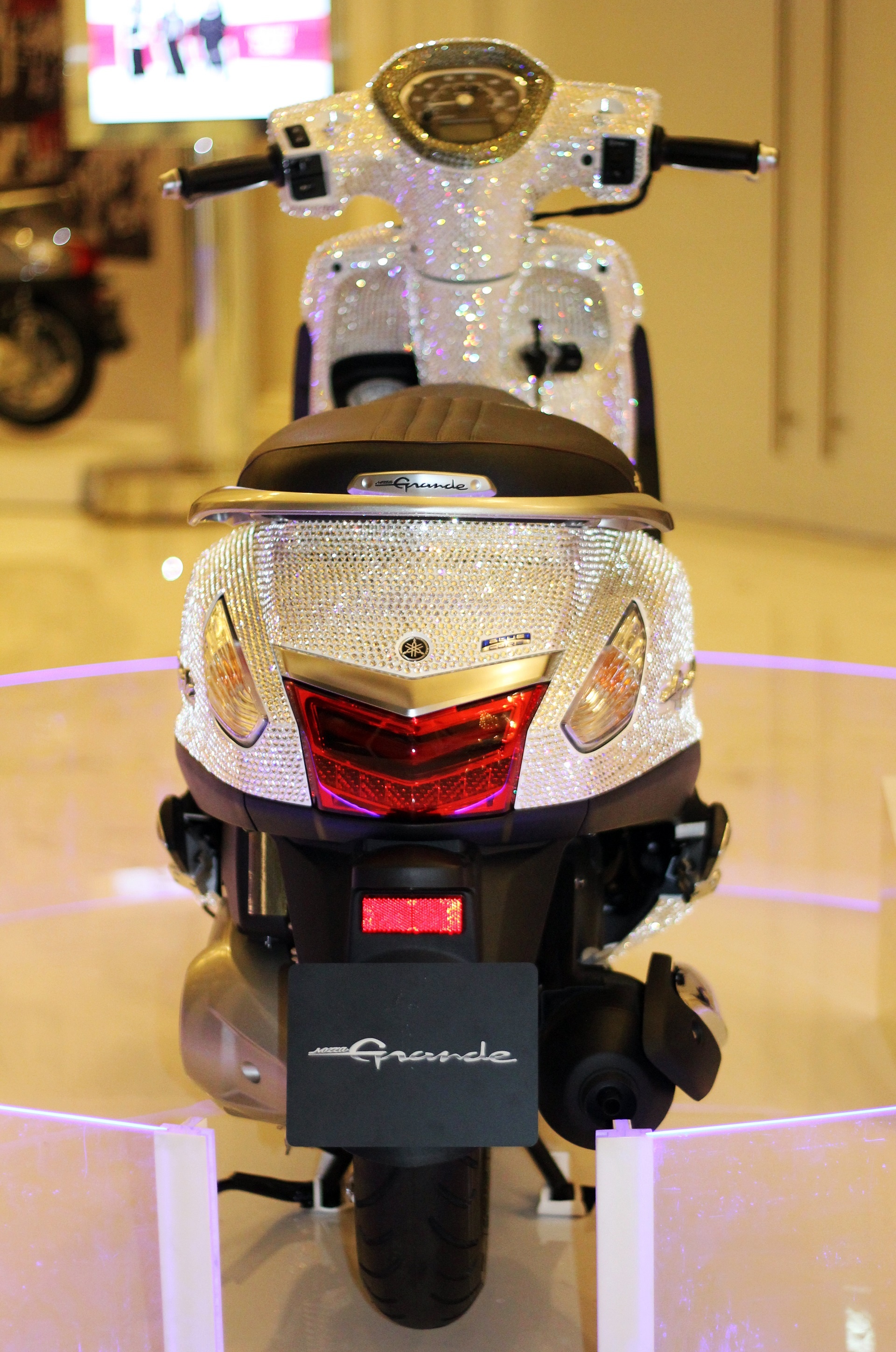 | Yamaha đã đem đến bất ngờ cho quan khách bằng việc trưng bày một chiếc xe đặc biệt ở sảnh. Yamaha Grande được phủ bằng hàng nghìn viên pha lê cao cấp Swarovski cắt hình kim cương. |