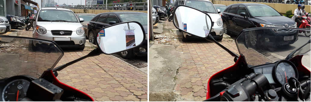| Hai bên là bộ đôi kính chiếu hậu với tông màu đen, đường nét thiếu tinh tế, bầu gương lại to và hơi thô. Nhưng bù lại có góc quan sát rộng. |