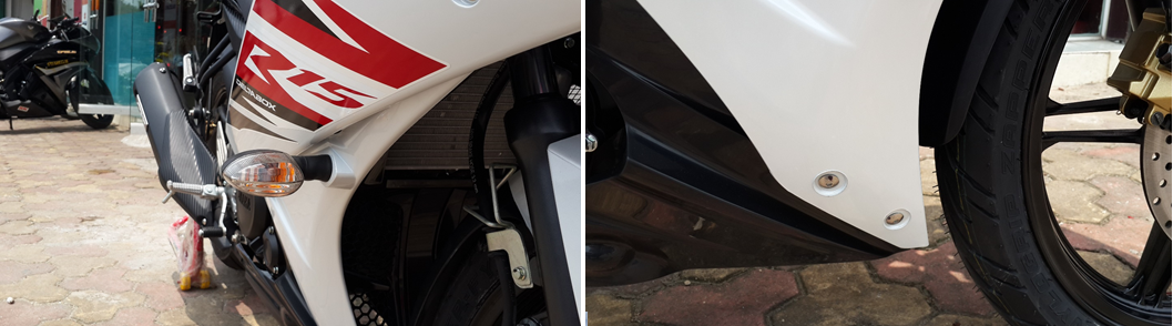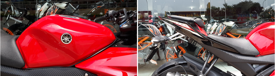 | Yamaha R15 sở hữu tem màu độc đáo và trẻ trung. Với phiên bản màu đỏ Dunhill, phần đầu và bình xăng màu đỏ nổi bật trên khung xe màu đen. Tem thương hiệu R15 được dán phần bên hông mang lại sự phá cách trong thiết kế. Phần đầu xe có đèn pha đôi phong cách “cú mèo”. Đèn lớn và sáng hơn phiên bản cũ. Mặt kính chắn gió tôn thêm vẻ sành điệu của xe. |