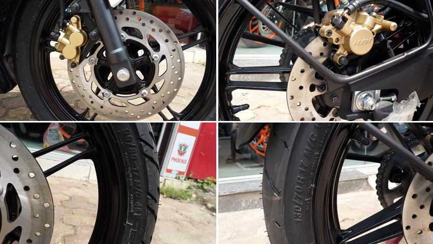 | Phần thắng đĩa trước thủy lực cho lực tay bóp phanh nhẹ hơn. Khả năng phanh đảm bảo an toàn hơn. Lốp trước có kích thước 90/80 -17. Lốp sau to hơn với kích thước 130/70 R17. |