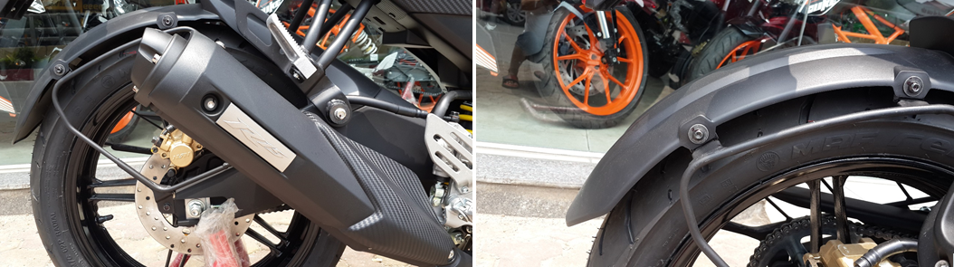| Ống bô zin hơi to, kết hợp màu đen và xám, âm thanh phát ra êm, người chơi có thể thay thế theo sở thích cá nhân. Phần ốp bánh sau chống bẩn và bắn nước khi đi trong trời mưa. |