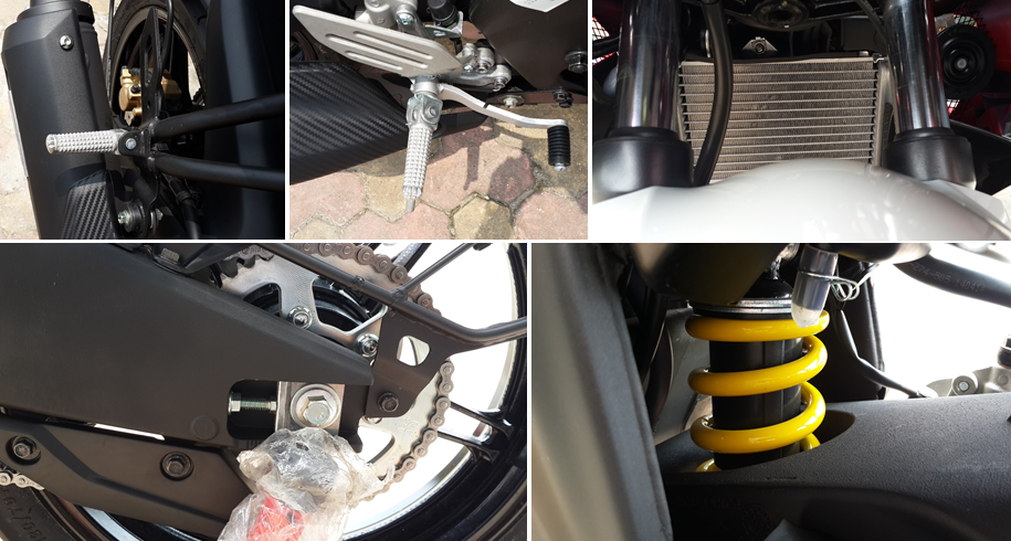 | Phần để chân sau, để chân trước và chân phanh. Kèm theo đó là hệ thống làm mát bằng dung dịch với két, cùng với hệ truyền lực 6 cấp thể thao qua xích và đến trục banh sau. Giảm xóc sau theo kiểu Monocross với lò xo màu vàng nổi bật. |