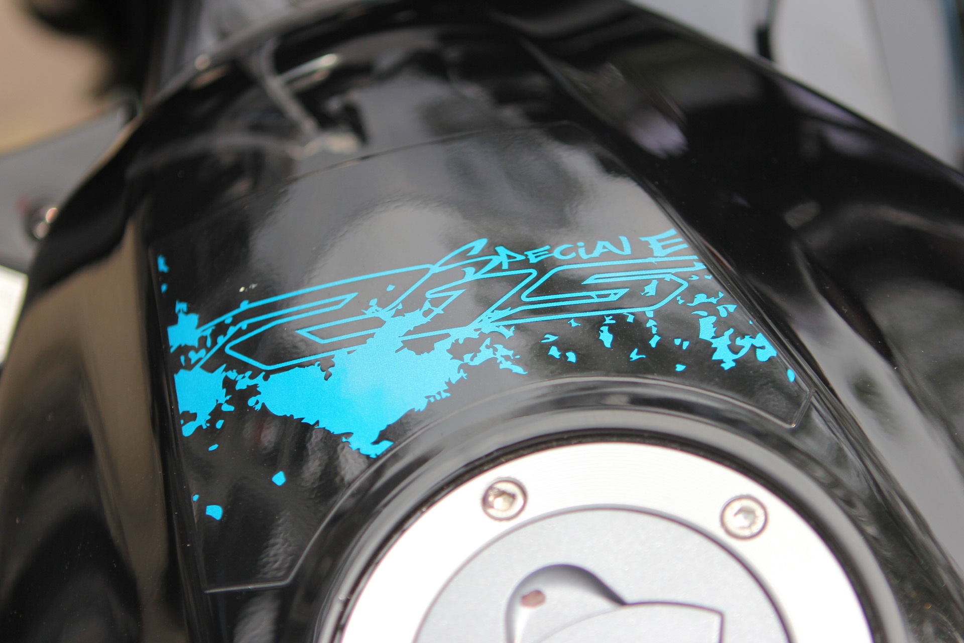| Bình xăng được dán tem Special Edition theo các phong cách khác nhau. Bộ tem của phiên bản màu xanh cyan dường như lấy cảm hứng từ nghệ thuật đường phố graffiti. |