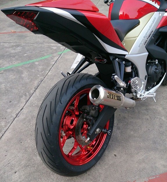 Ngoài ra, bộ vành xe cũng được sơn lại thành màu đỏ cả trước và sau khá nổi bật. Yên xe cho người ngồi phía sau cũng được thiết kế lại.