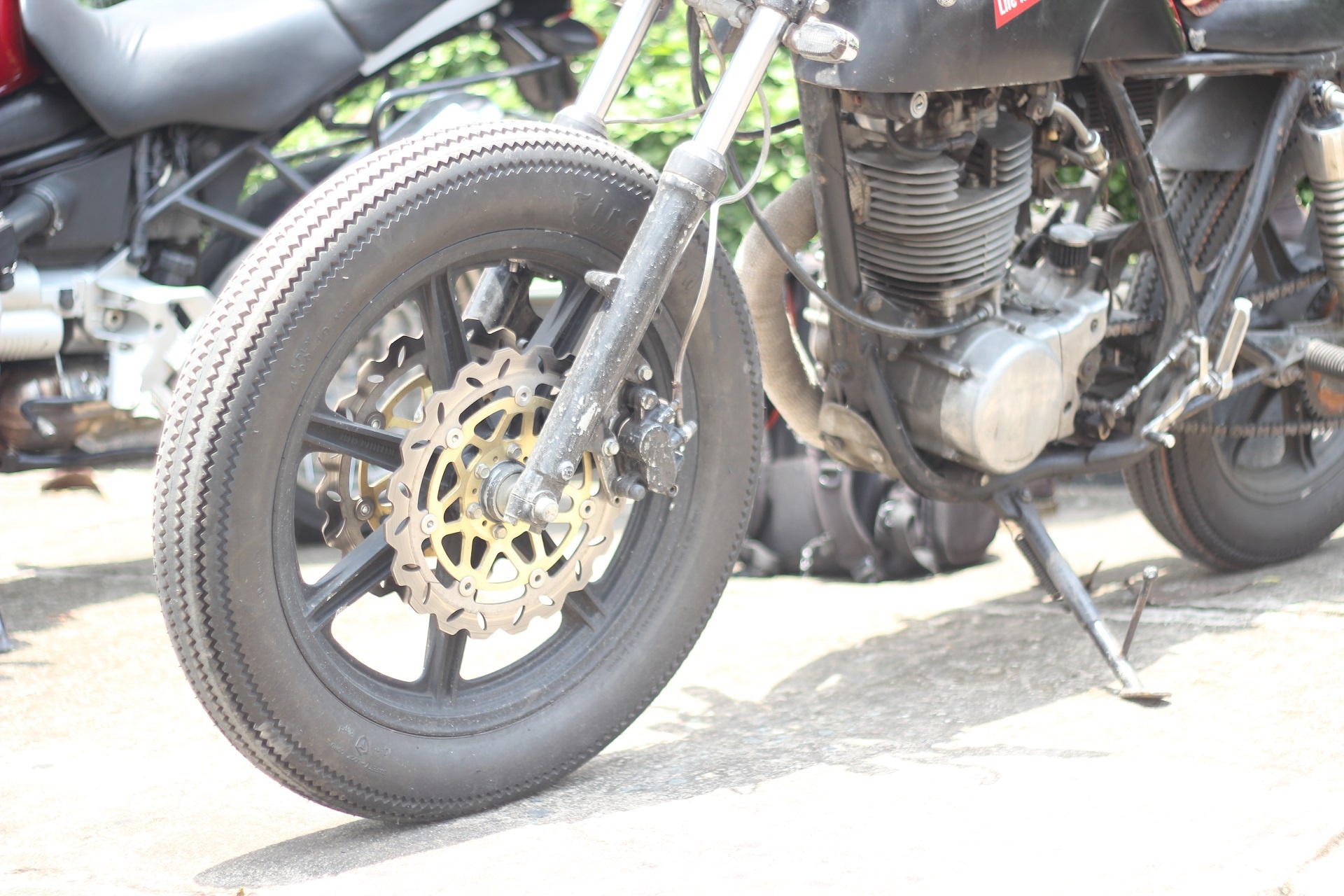 | Chiếc xe độ được dựng lên từ Yamaha SR500. Điểm gây ấn tượng trên xe có lẽ là cặp lốp khá lớn của hãng Firestone. |