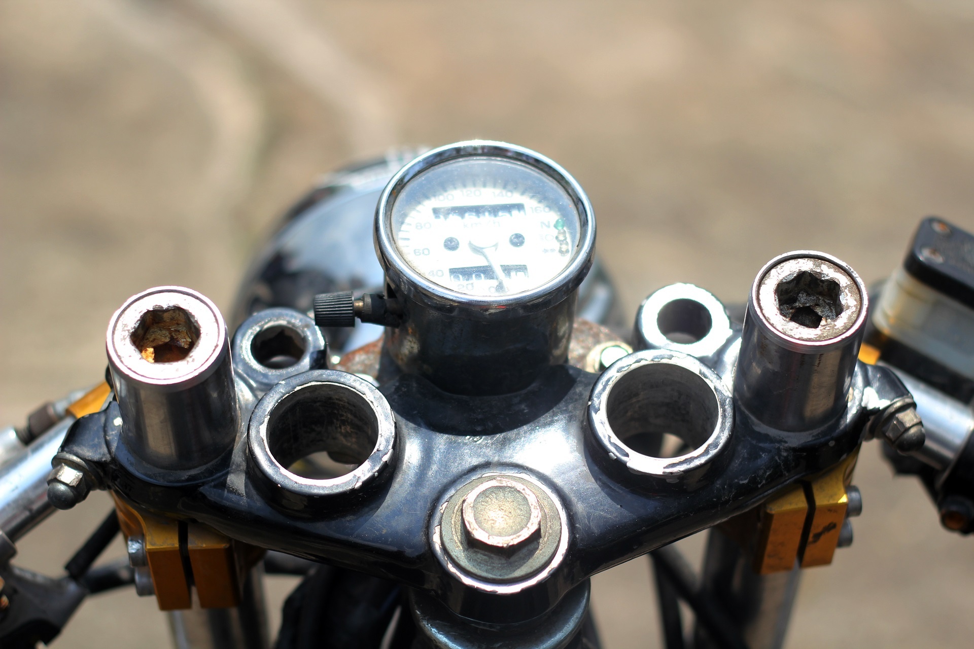 | Tay lái bằng thép với mặt đồng hồ trung tâm khá đơn giản thường thấy trên những mẫu xe cafe racer thông thường. |