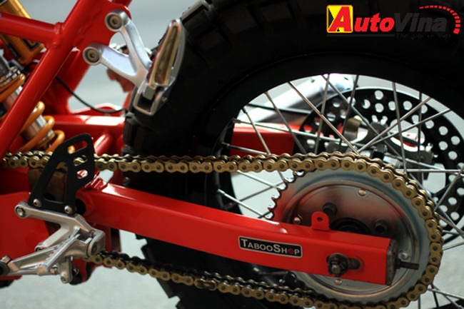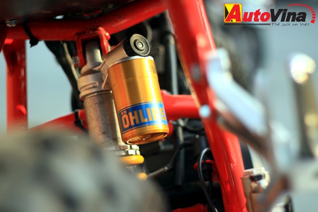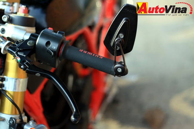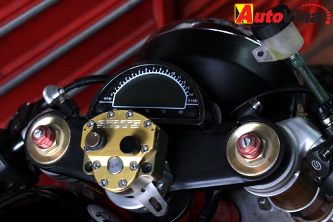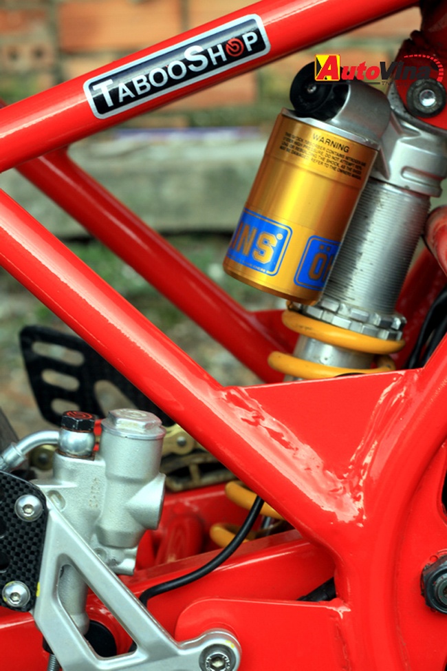 Xe còn được trang bị thêm hàng loạt đồ hiệu như phần bánh trước được “độ” cặp phuộc Up side down hành trình ngược lấy từ xe Suzuki GSX, đĩa phanh hàng hiệu của Brembo, heo dầu Tokico của xe Kawasaki Z1000 và trợ lực trung tâm Scotts; phuộc sau dạng monoshock có thể điều chỉnh được đến từ thương hiệu Ohlins nổi tiếng, gác chân của Aprilia RSV4 đi cùng pen đạp Brembo đã được thay vào, đĩa phanh sau hiệu BrakeTech đi cùng heo dầu Brembo là sự kết hợp không thể tốt hơn.