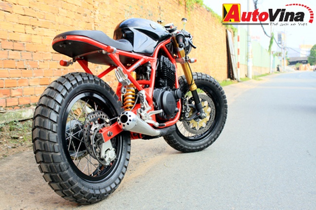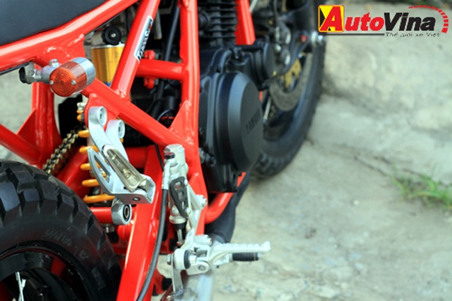 Cặp mâm đúc nguyên bản của SRX 250 đã được thay thế bởi cặp bánh căm niềng dạng Cafe Racer độc đáo đi cùng vỏ hiệu Vee Rubber.