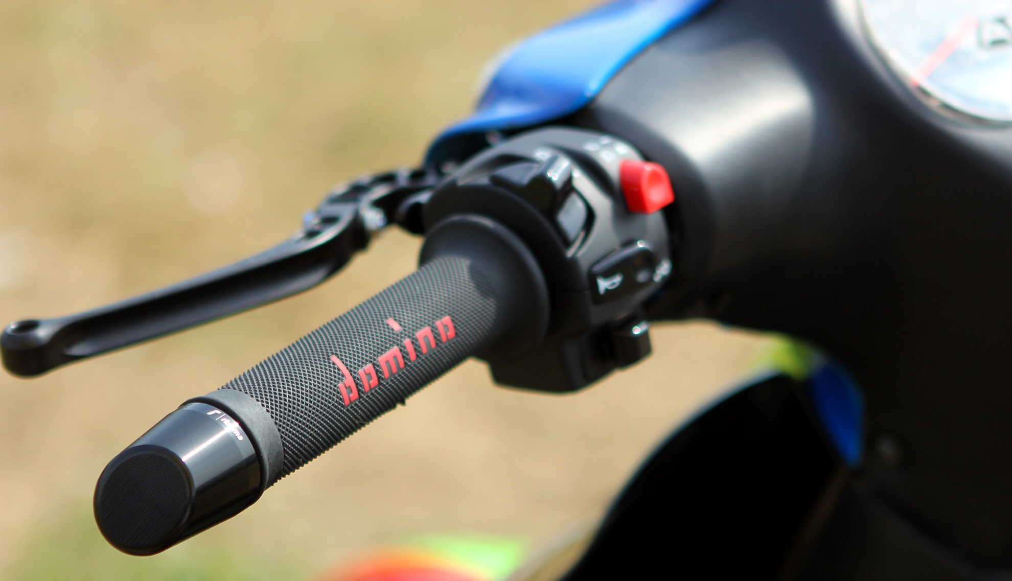 | Một số đồ chơi được gắn thêm cho xe, như bao tay Domino, cùm côn CRG GP, cùm công tắc Domino. |