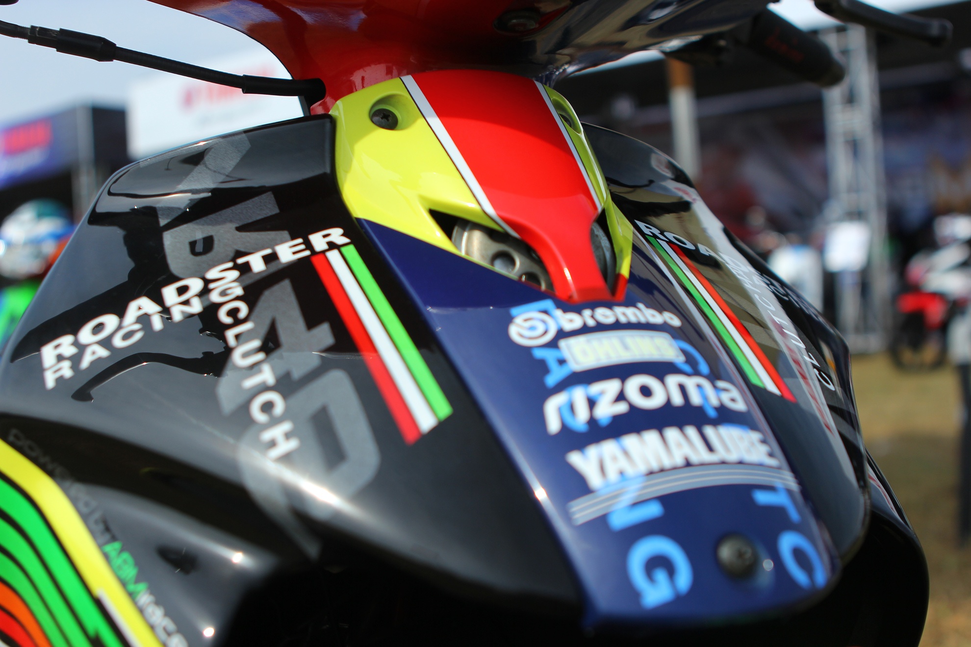Dàn vỏ của chiếc xe 2 thì được sơn các mảng màu nổi bật, lấy màu xanh da trời làm chủ đạo, bên cạnh các logo thường thấy trên mũ bảo hiểm và xe đua của Rossi.
