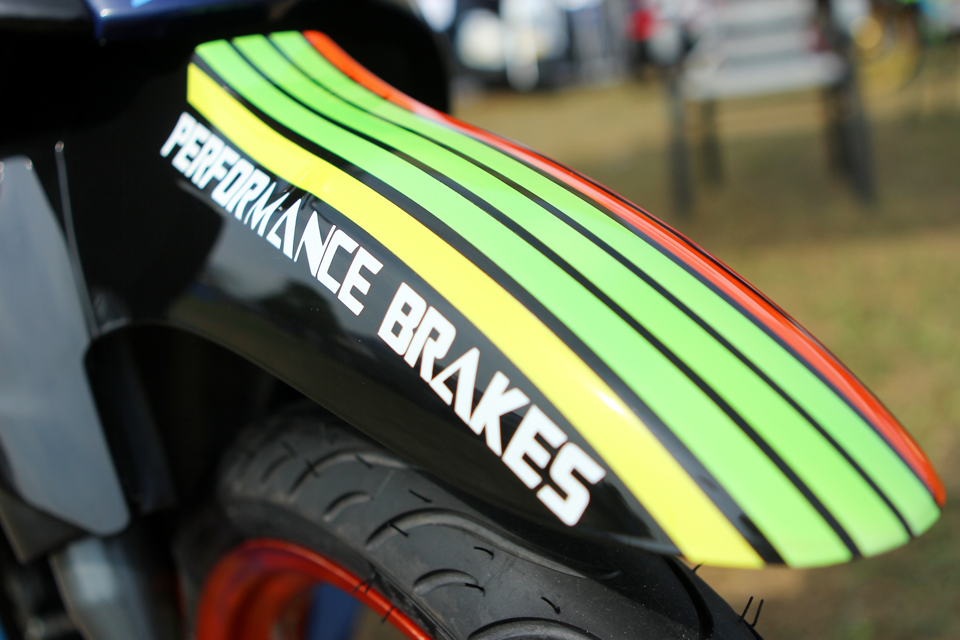 | Cặp vành CNC Racingboy 2014 màu cam cũng là một điểm nhấn khác trên chiếc xe. Thời gian hoàn thiện việc sơn tem đấu cho dàn áo này là khoảng 10 ngày. |