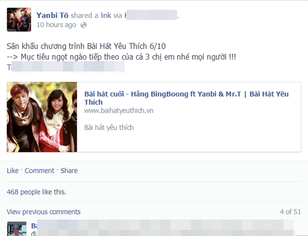 Ngoài những hình vui tươi, Yanbi cũng lên tiếng thể hiện thái độ thách thức với khán giả của mình. Tuy nhiên, ngay sau đó, status này đã được xóa khỏi trang cá nhân của anh.