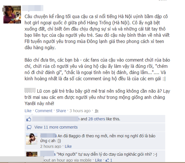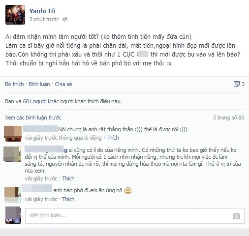 | Một đoạn status của cư dân mạng có nickname V.T thể hiện quan điểm trước những status của Yanbi. |
