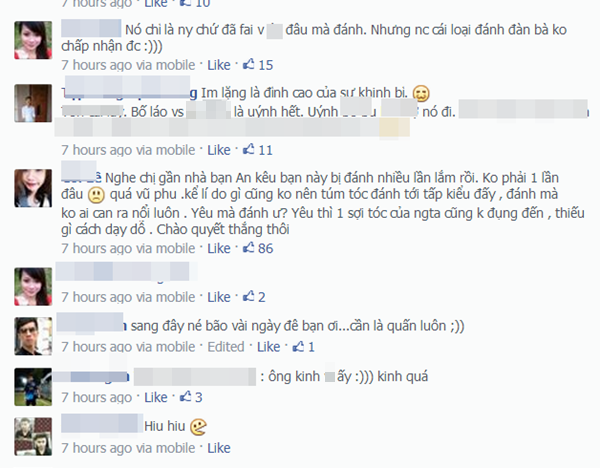 "Con trai đánh con gái, đàn bà quá về mua váy mà mặc đi. Làm xấu mặt đàn ông Việt Nam quá, con gái để yêu chứ không phải để đánh đập chửi bới. Không biết chuyện riêng của 2 anh chị là gì, nhưng một thằng đàn ông đi đánh con gái là quá hèn rồi", một dân mạng bình luận.