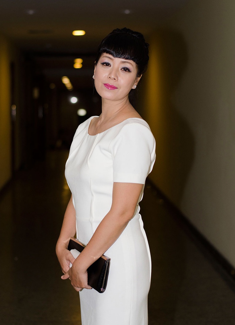 Nữ diễn viên Chiều Xuân trẻ trung trong chiếc đầm trắng. Chị được mời bình luận các tiết mục biểu diễn trong tháng này.