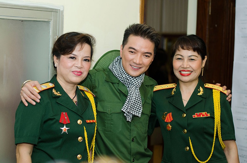 | Đàm Vĩnh Hưng diện trang phục bộ đội trên sân khấu. Trong hậu trường, anh không quên ghi lại kỷ niệm với hai người chị diễn cùng. |