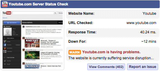 | Thông báo trên isitdownrightnow.com cho thấy máy chủ của YouTube bị sập trong khoảng 12 phút. |