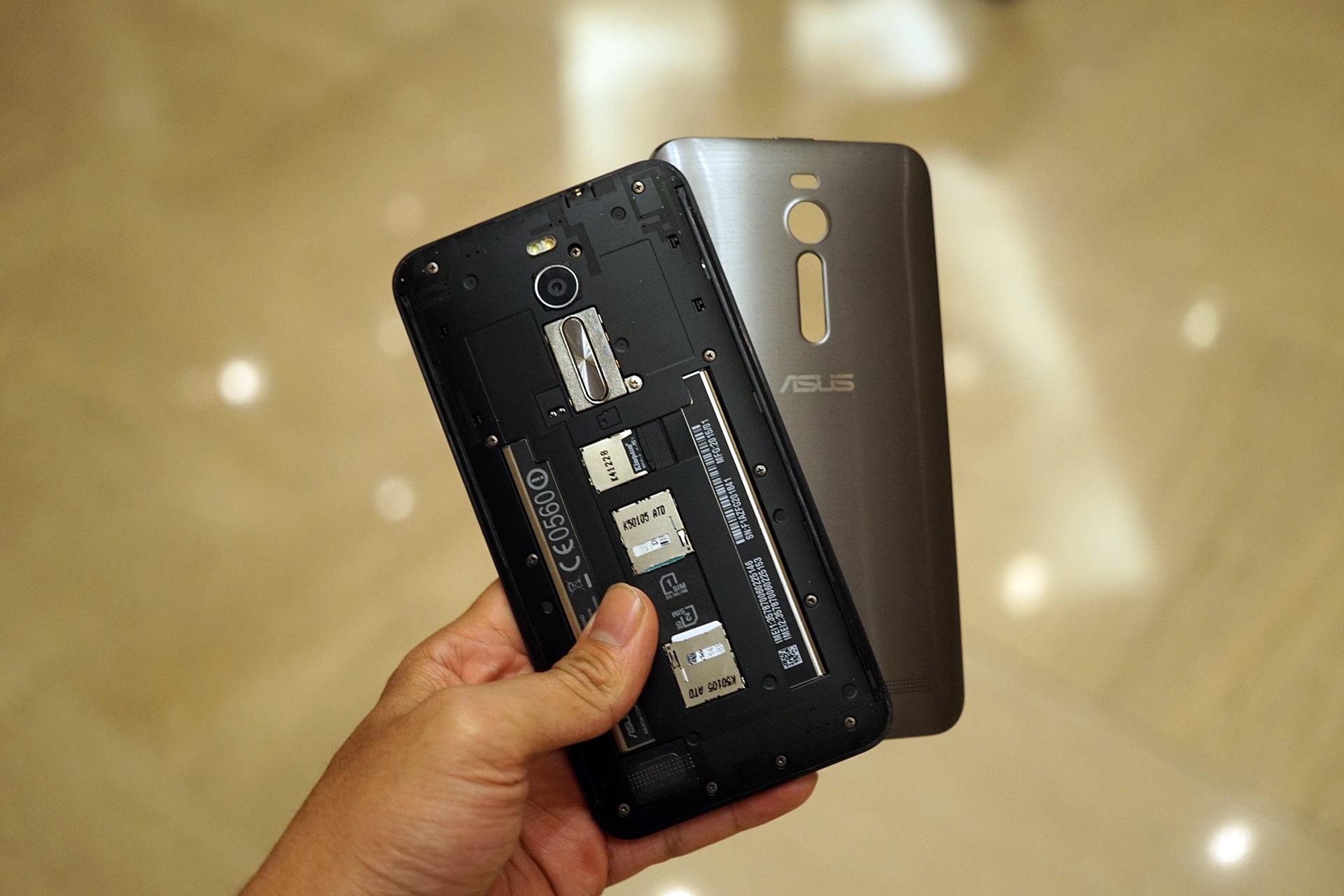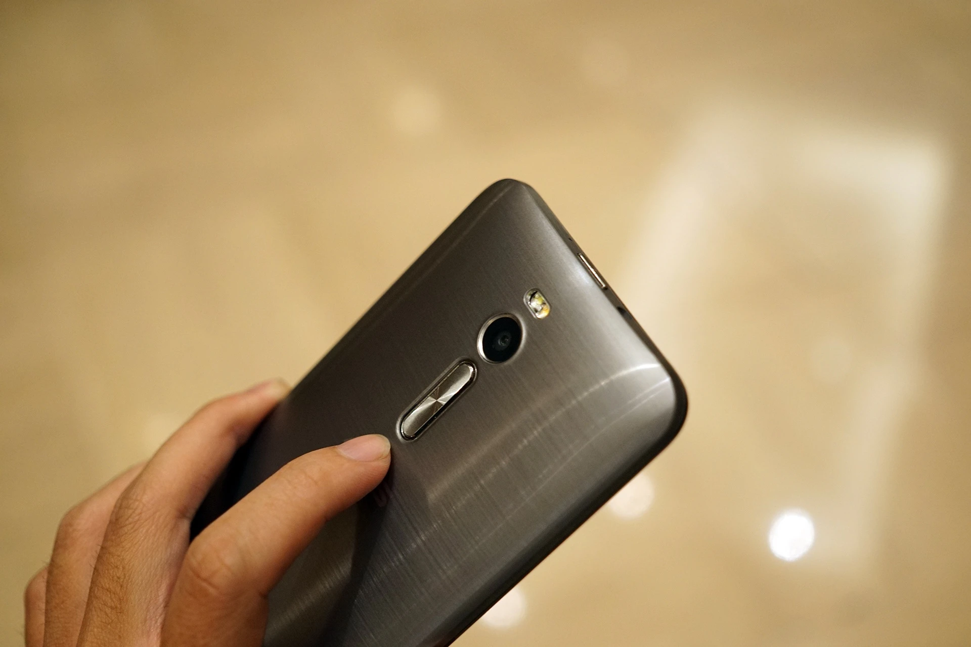 | Ngoài mặt trước có phong cách thiét kế giống loạt Zenfone năm 2014, Zenfone 2 có mặt sau bằng nhựa vân xước giống với LG G3. Bên cạnh đó, hai phím tăng giảm âm lượng cũng được đưa ra mặt sau, ngay dưới cụm camera. |