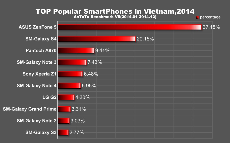 Zenfone 5 là smartphone được người dùng thử nghiệm AnTuTu nhiều nhất, không có nghĩa là sản phẩm này bán chạy nhất trên thị trường. Theo thống kê của GfK, Samsung vẫn thống trị thị trường smartphone Việt Nam, tiếp đó là Nokia. Asus là tên tuổi mới và họ đang có thị phần ở mức dưới 2 con số, cao hơn Sony, HTC.