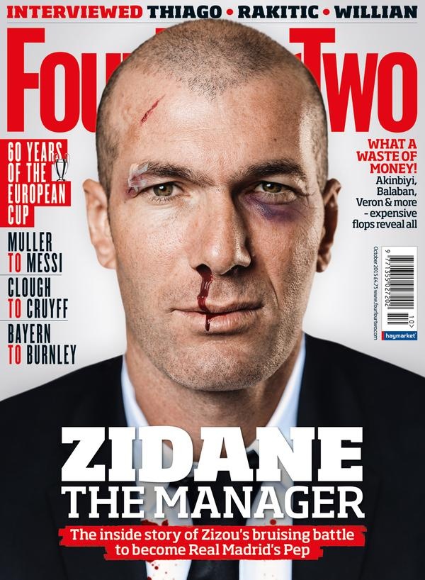 Trên trang bìa của tạp chí số ra tháng 9/2015, ban biên tập FourFourTwo gây sốc khi đăng tấm ảnh Zizou với gương mặt trầy xước, mắt trái thâm tím và mũi chảy máu. Họ giải thích đó không phải là kết quả của vụ thiết đầu công với Materazzi cách đây 9 năm, mà là hình ảnh Zidane sau một mùa giải dẫn dắt Real Madrid Castilla.