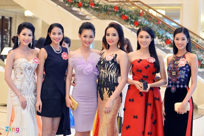 | Các người đẹp Hoa hậu Việt Nam 2014 diện trang phục dạ hội dự tiệc ngày 5/12. Ảnh: Tuấn Mark |