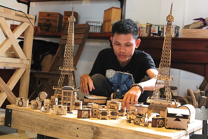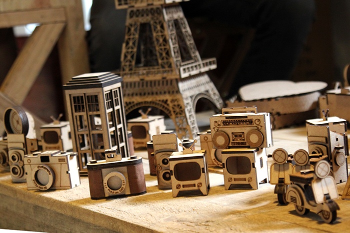 | Đủ loại mô hình 3D làm bằng gỗ được chế tác tinh xảo, như máy ảnh,máy hát đĩa, xe vespa... có giá từ 100.000 - 400.000 đồng/sản phẩm. |